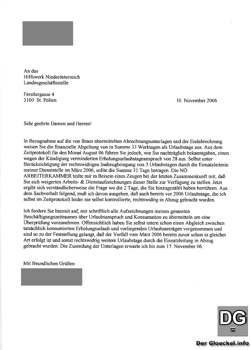 Abrechnung vom NÖ HILFSWERKFaksimile der Abrechnung der Dientnehmerin vom HILFSWERK weist 33 Uraubstage ausJetzt wird es heftig, denn der Leiter „Personal“ sagt als Zeuge aus, daß 28 Tage an die Dienstnehmerin ausbezahlt wurden. Die Zahl 28 ist als bedeutend anzusehen, denn laut Zeitprotokoll und den uns vorliegenden Unterlagen, haben wir auch durch die Aussage der betroffenen Dienstnehmerin, den Nachweis erbracht, daß dieser im März 2006 drei einzelne nicht aufeinander folgende Tage rechtswidrig, ohne deren Wissen in Abzug gebracht wurden, weil die Dienststelle laut Angabe der Betroffenen offensichtlich keine Arbeit für sie hatte und ihr einfach „dienstfrei“ gab. Andere DienstnehmerInnen gaben zu diesem Sachverhalt an, daß bei ihnen bei Eintreten eines solchen Umstandes „Gutstunden“ in Abzug gebracht werden/wurden. Mit diesem Sachverhalt wurde auch die Arbeitnehmervertretung, die NÖ ARBEITERKAMMER betraut, der das HILFSWERK die Aushändigung der einschlägigen Arbeitsaufzeichnungen verweigerte. Auch der schriftlichen Aufforderung der Dienstnehmerin um Übermittlung der Unterlagen kam das HILFSWERK innerhalb gesetzter Frist nicht nach. Tatsächlich erhielt diese dann 33 Urlaubstage verrechnet. Im Zuge des juristischen Verfahrens hat Glöckel als Beweismittel die Vorlage der betreffenden Urlaubsanträge vom HILFSWERK gefordert, die jede Dienstnehmerin auf ihrer Dienststelle ausfertigen muß, die jedoch nicht existieren können, weil die Beschäftigte für die besagten Tage gar keinen Urlaub beantragt hatte. Aber selbst dem Gericht legte das HILFSWERK, das über 7600 Beschäftigte in Österreich umfaßt (Eigenangabe) diese Beweismittel nicht vor.